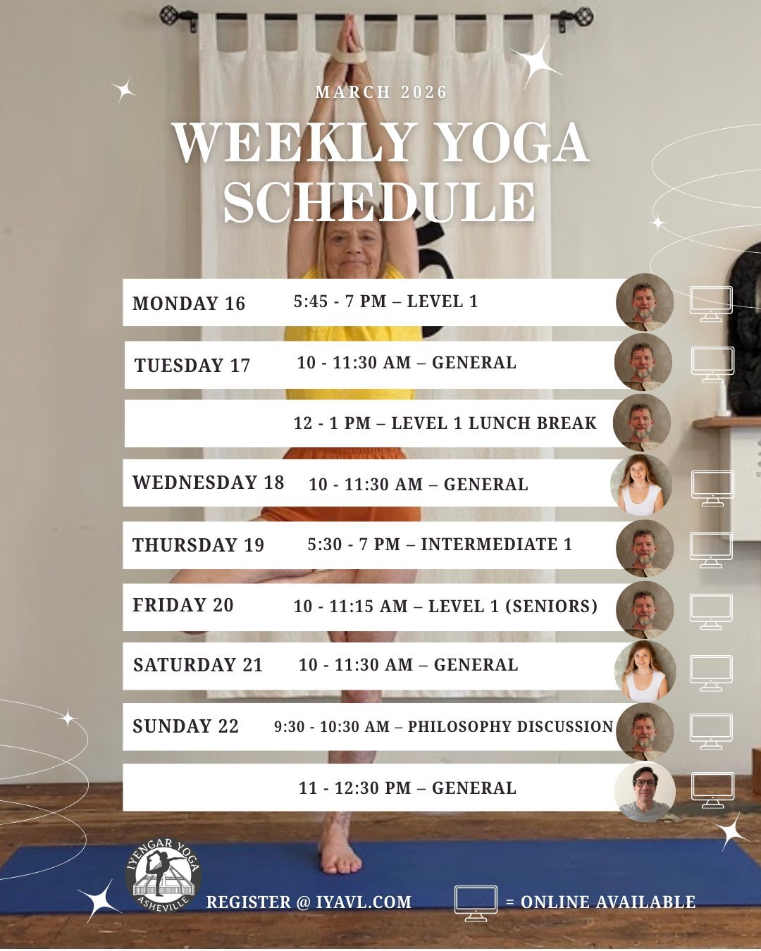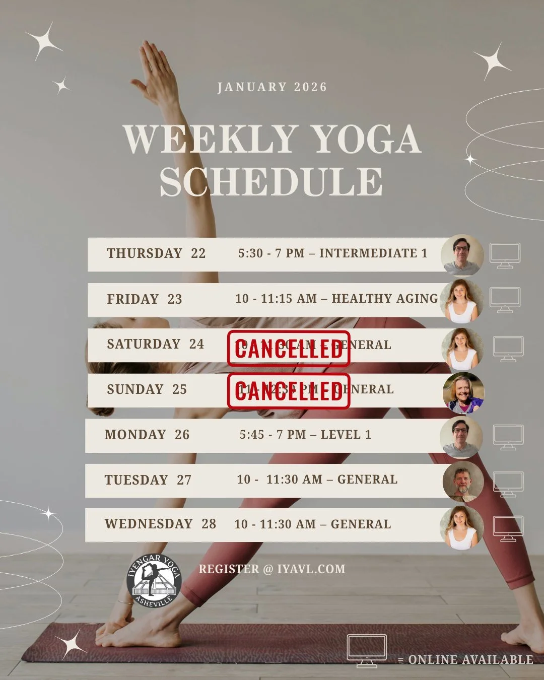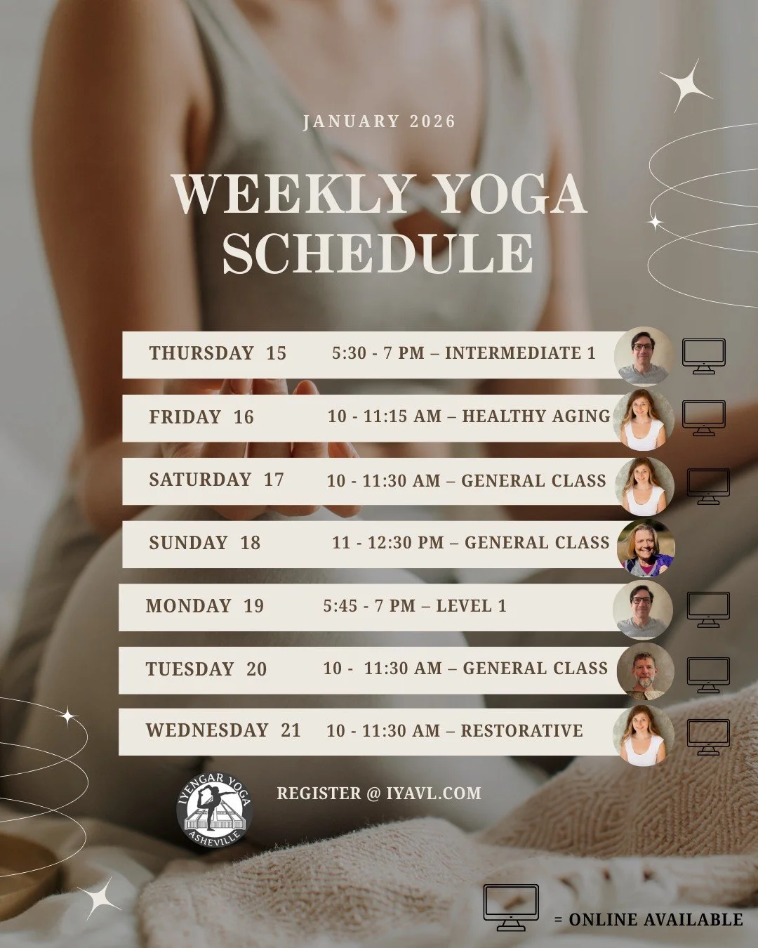 Iyengar Yoga Asheville is a peaceful, light-filled space designed for focused practice and mindful movement. Located in historic Grovewood Village in North Asheville—just around the corner from the Omni Grove Park Inn—our studio offers a warm and inviting atmosphere for students of all levels.
